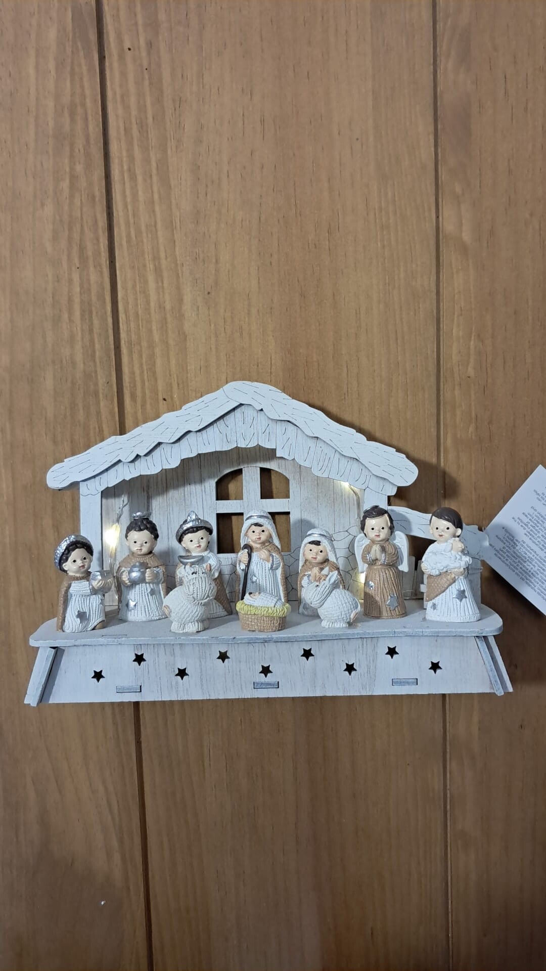 Nacimiento iluminado con luz de LED. Fabricado en madera y figuras de ceramica.