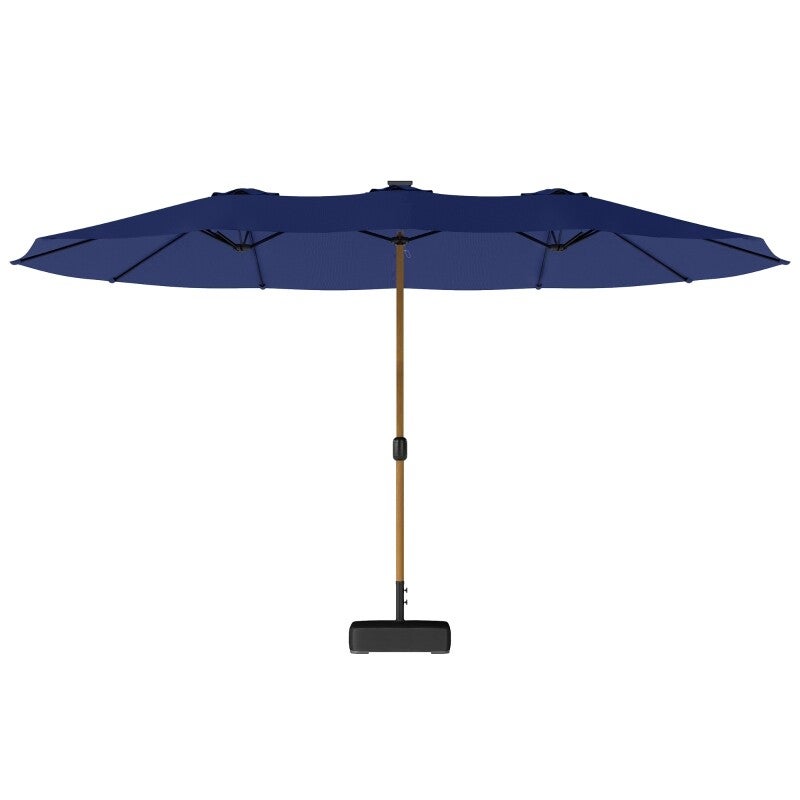 Sombrilla doble de gran tamaño con medidas de 459x266x235 cm, adecuada para mesas grandes o amplias zonas de jardín. Proporciona una sombra agradable para disfrutar del exterior con mayor comodidad durante el día.